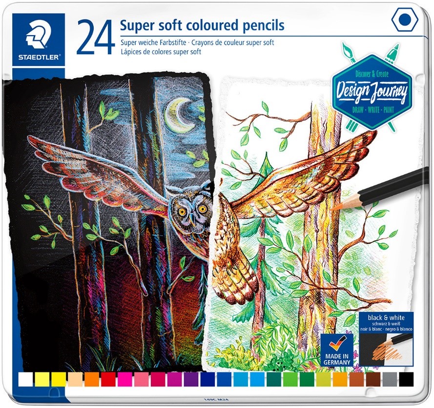 24 lapsa ngjyrosës Staedtler Super Soft. Secili prej këtyre lapsave me ngjyra individuale përmban plumb super të butë që lë një ngjyrë jashtëzakonisht të ndritshme në letrën e zezë dhe të bardhë.